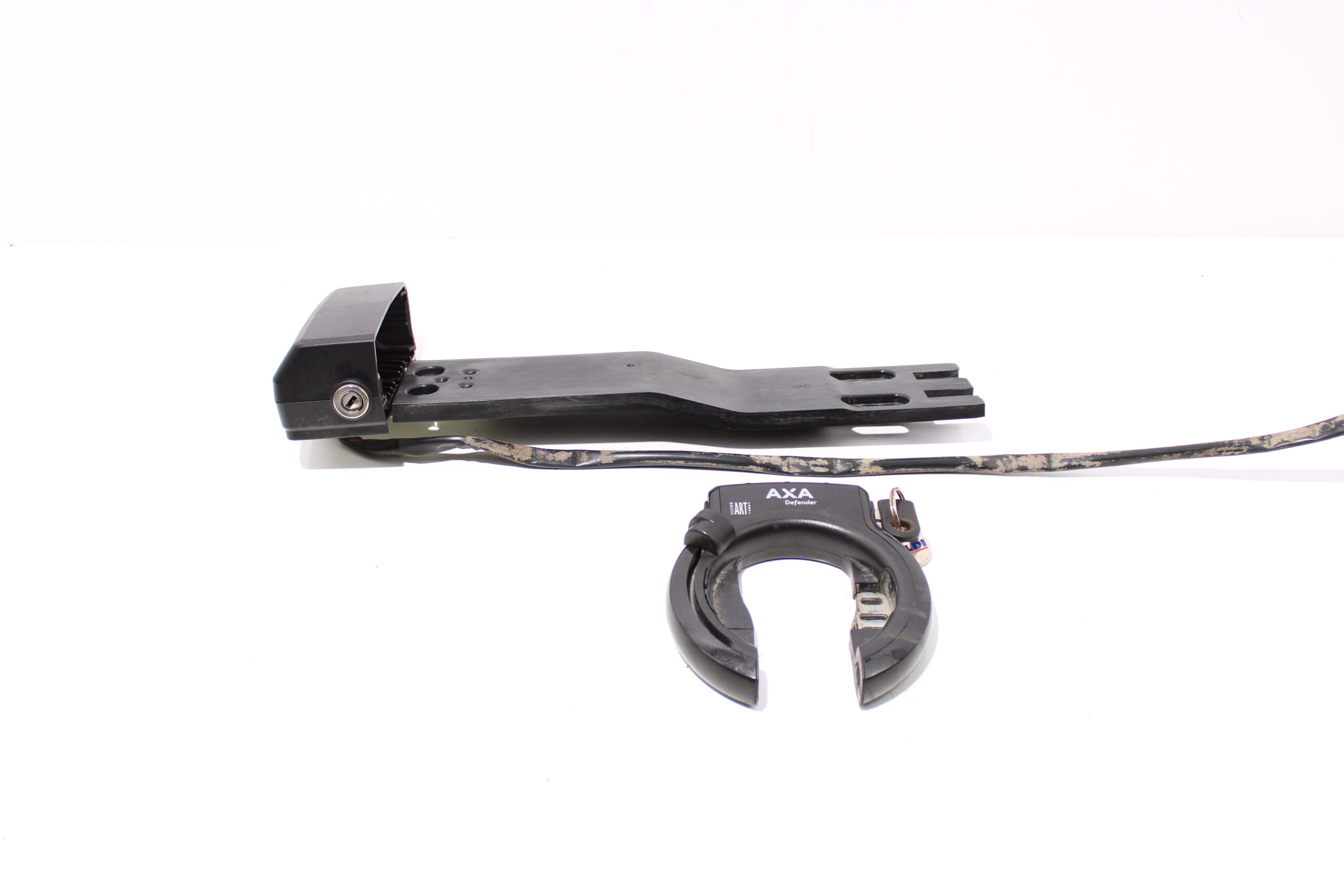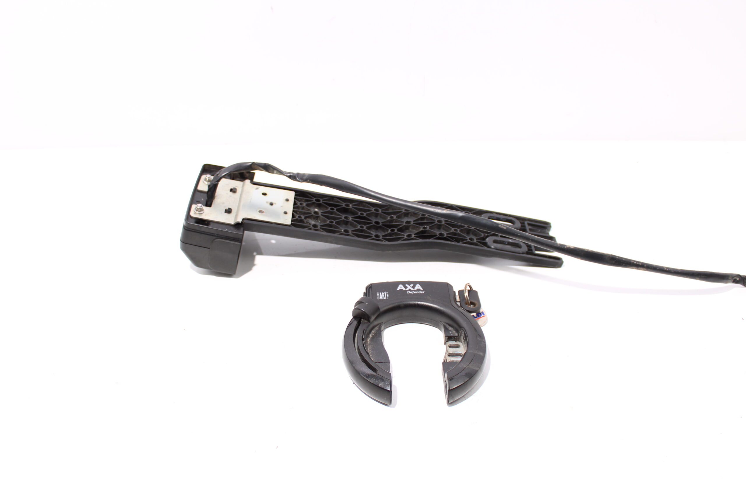 Artikel: Accu slede / dockingstation met sloten. Dit onderdeel is afkomstig van een Batavus Stream elektrische fiets. Toepasbaar op meerdere merken/type elektrische fietsen.