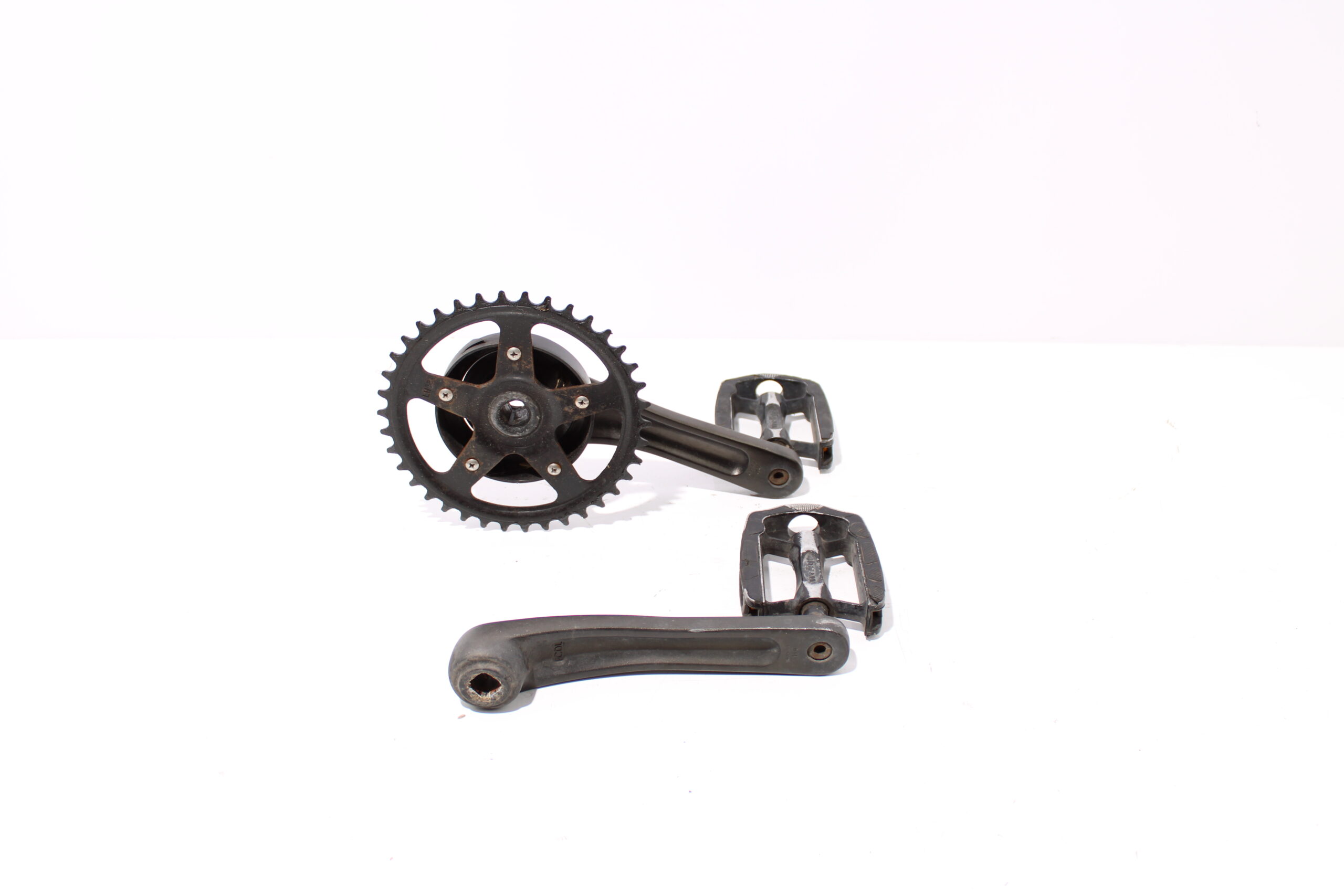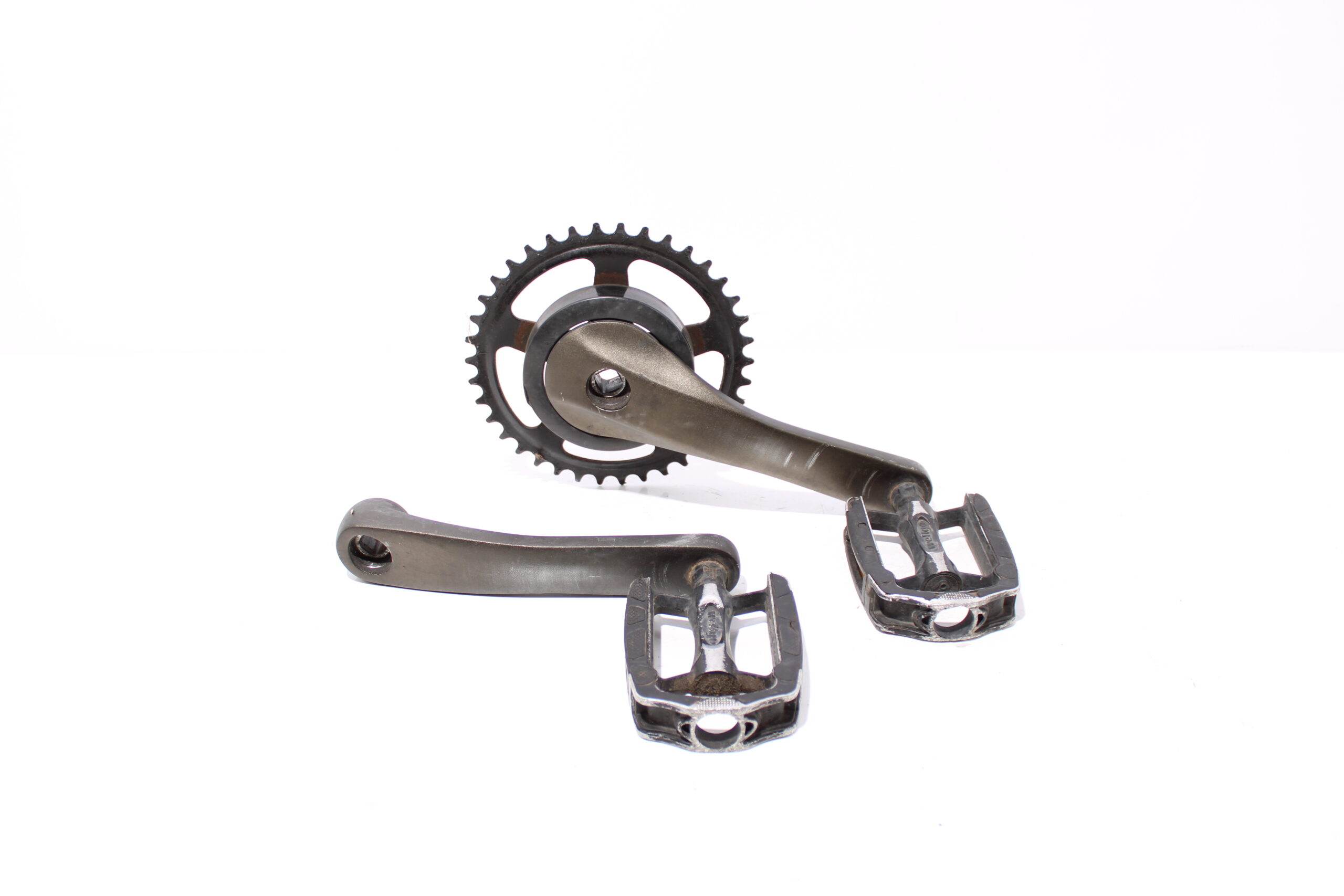 Artikel: Cranks, trappers en tandwiel. Dit onderdeel is afkomstig van een Forza Florence elektrische fiets.