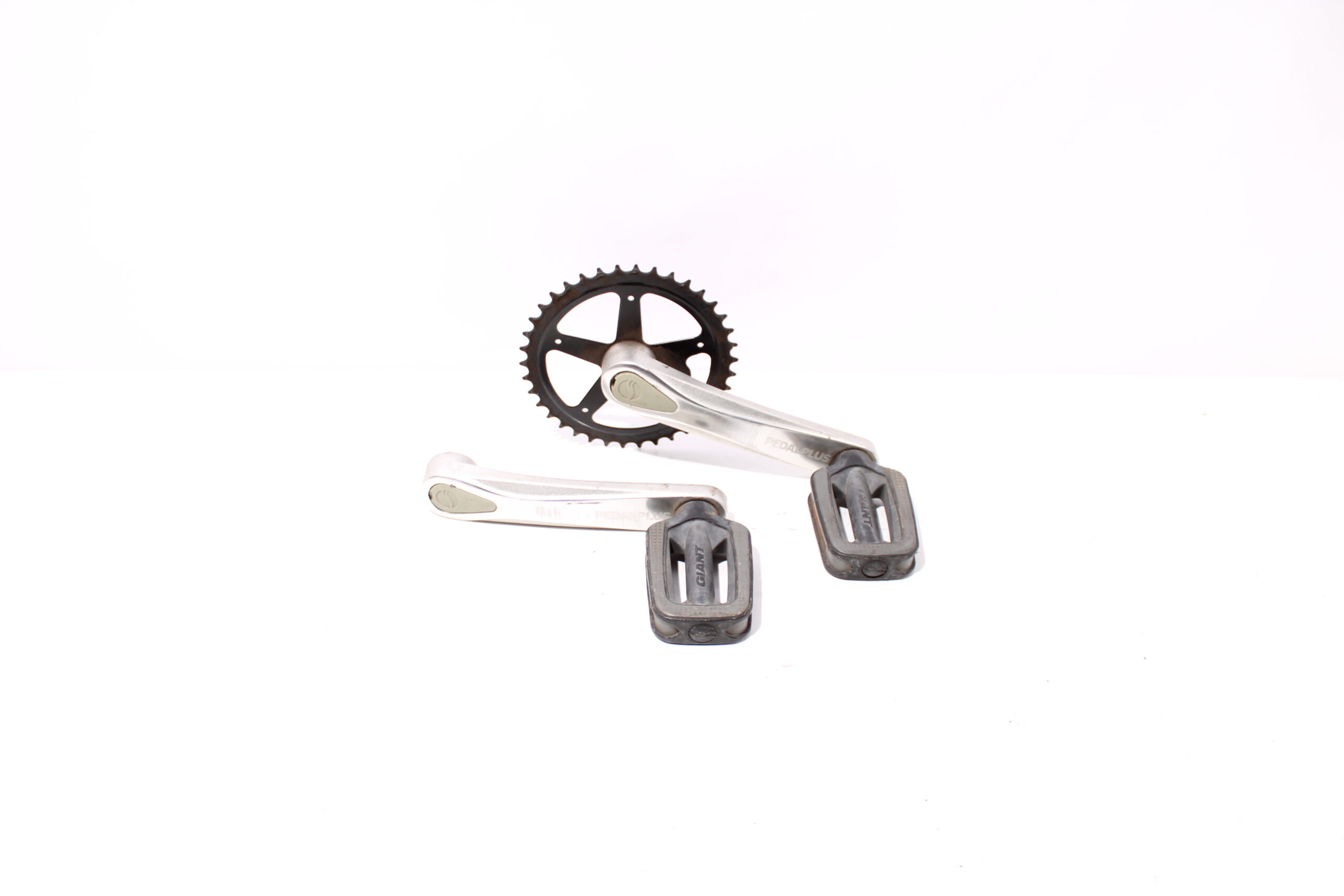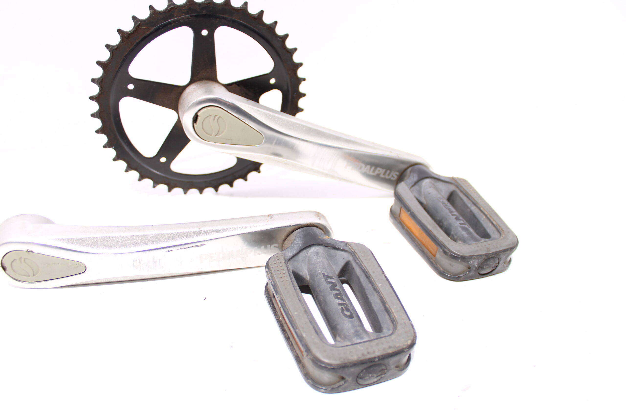 Artikel: Cranks, trappers en tandwiel. Dit onderdeel is afkomstig van een Giant Triple X elektrische fiets. Het betreft een originele onderdeel dat verkeert in goede staat, met mogelijke gebruikssporen.