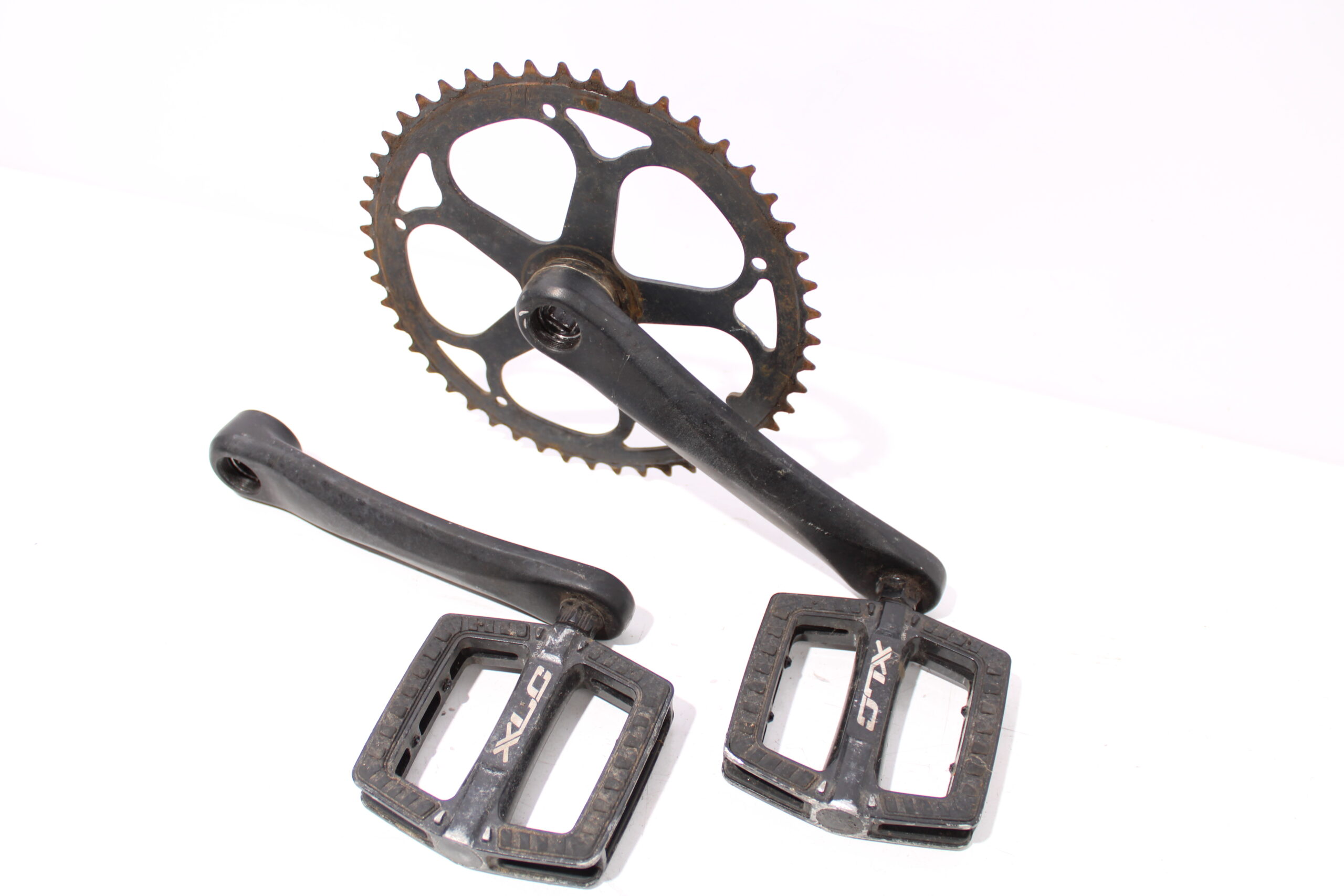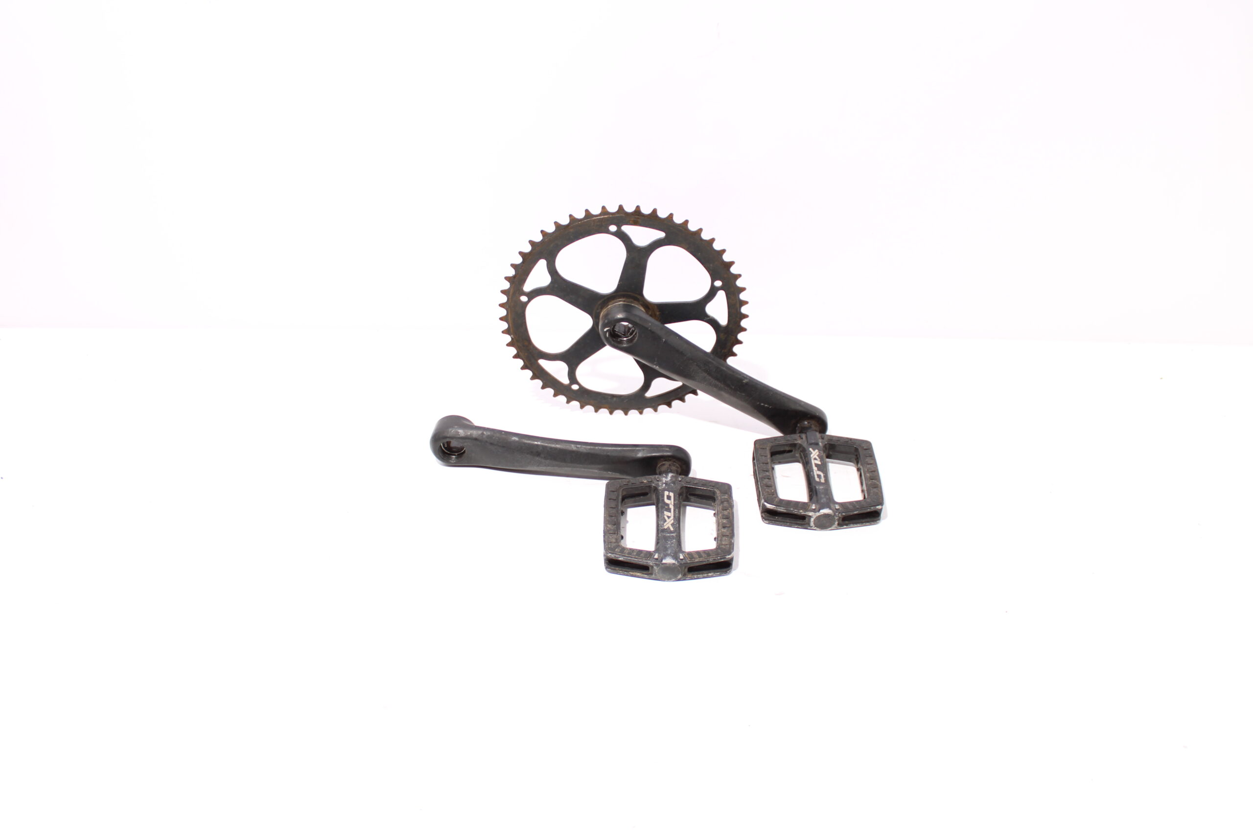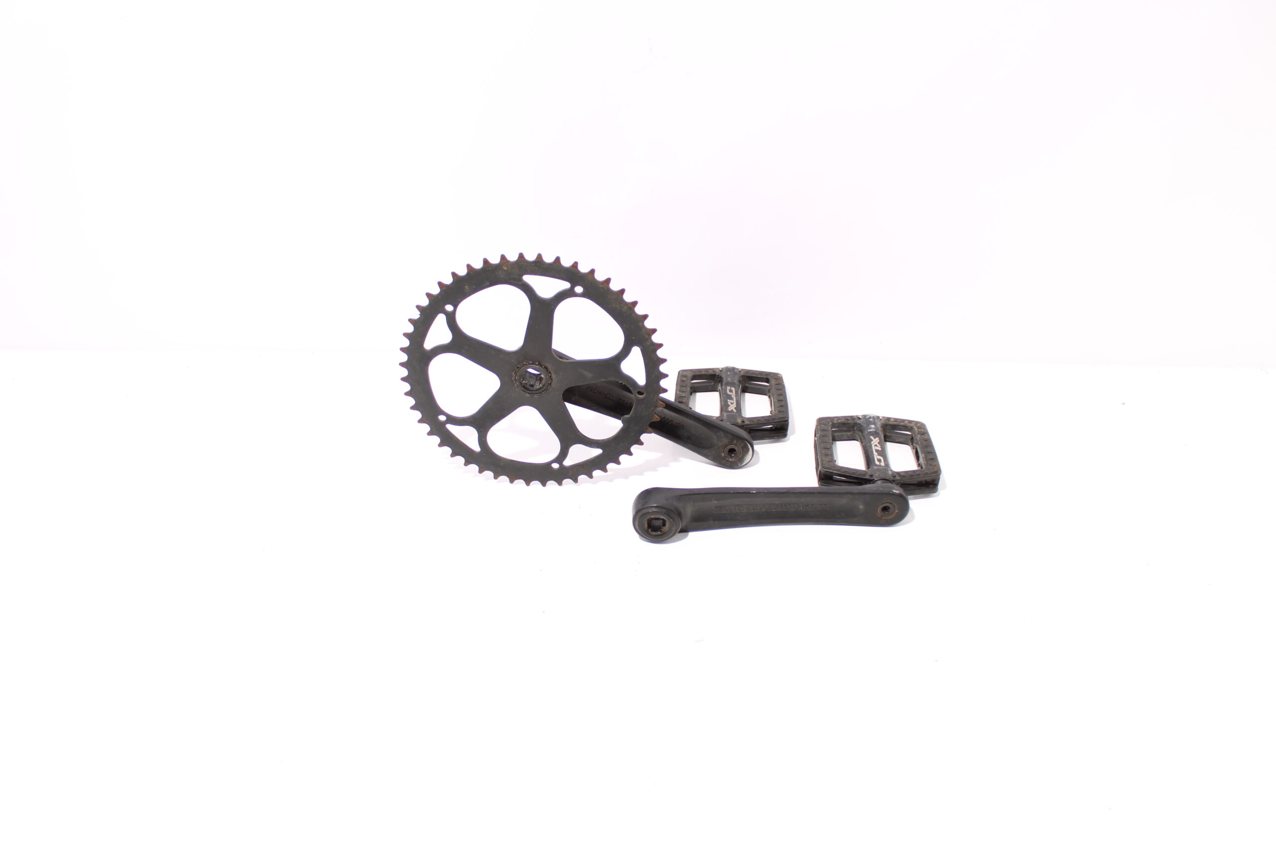 Artikel: Cranks, trappers en tandwiel. Dit onderdeel is afkomstig van een Knaap AMS elektrische fiets. Het betreft een originele onderdeel dat verkeert in goede staat, met middelmatige gebruikssporen.