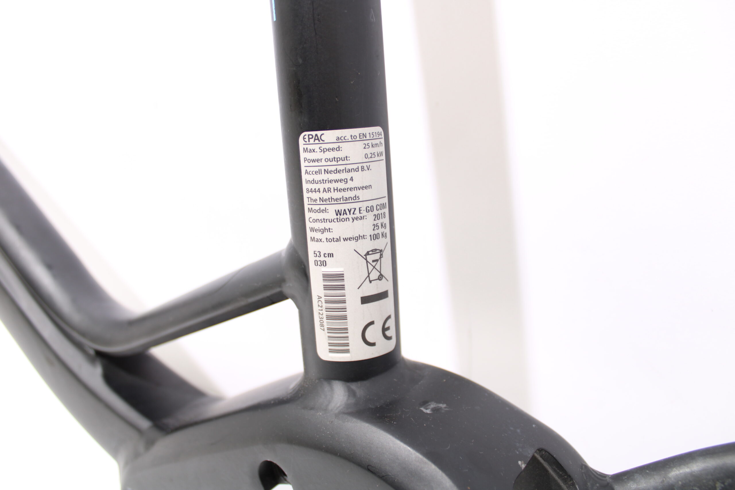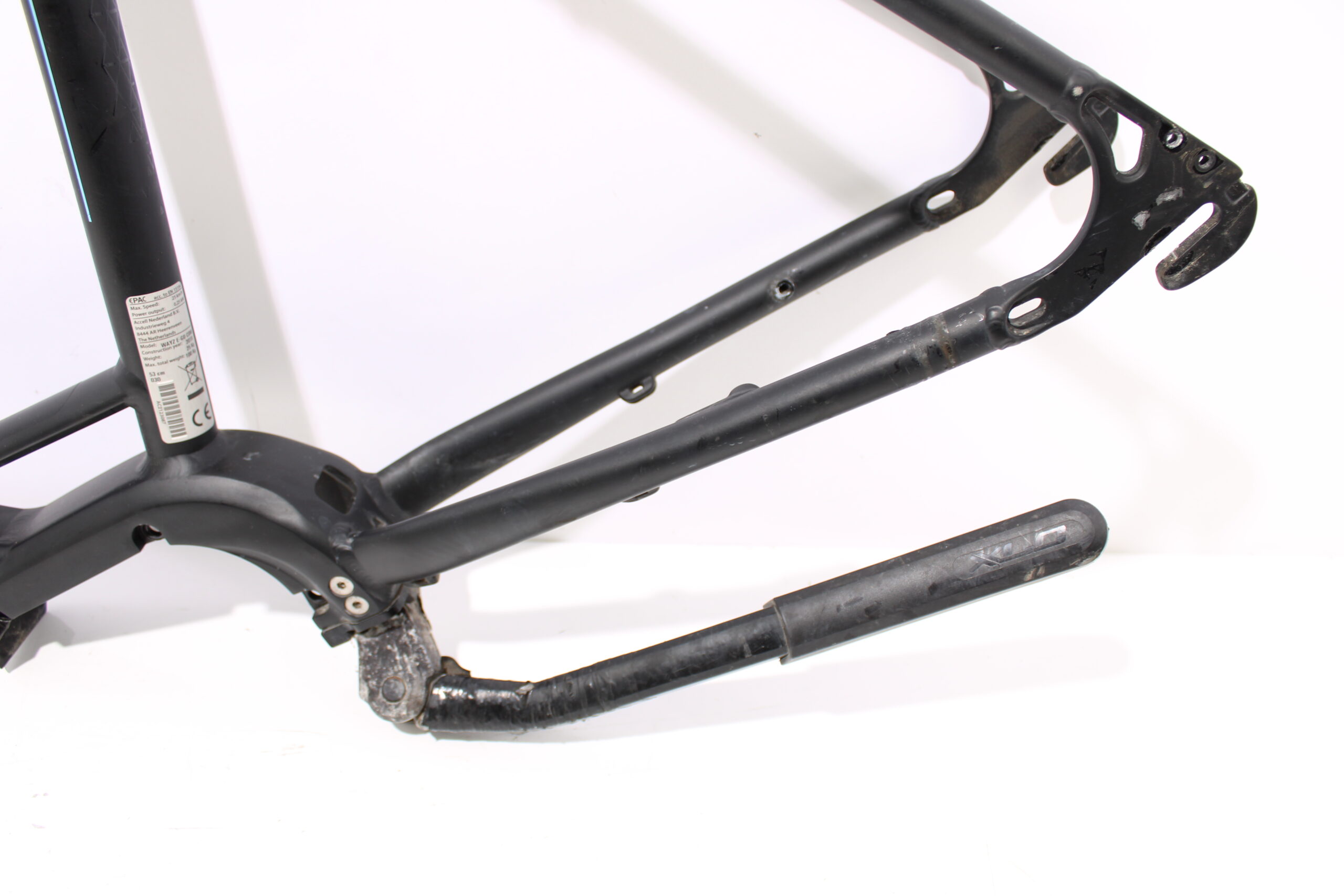 Artikel: Frame met maat 53, geschikt voor een E-motion middenmotor. Dit onderdeel is afkomstig van een Batavus Wayz Ego elektrische fiets.