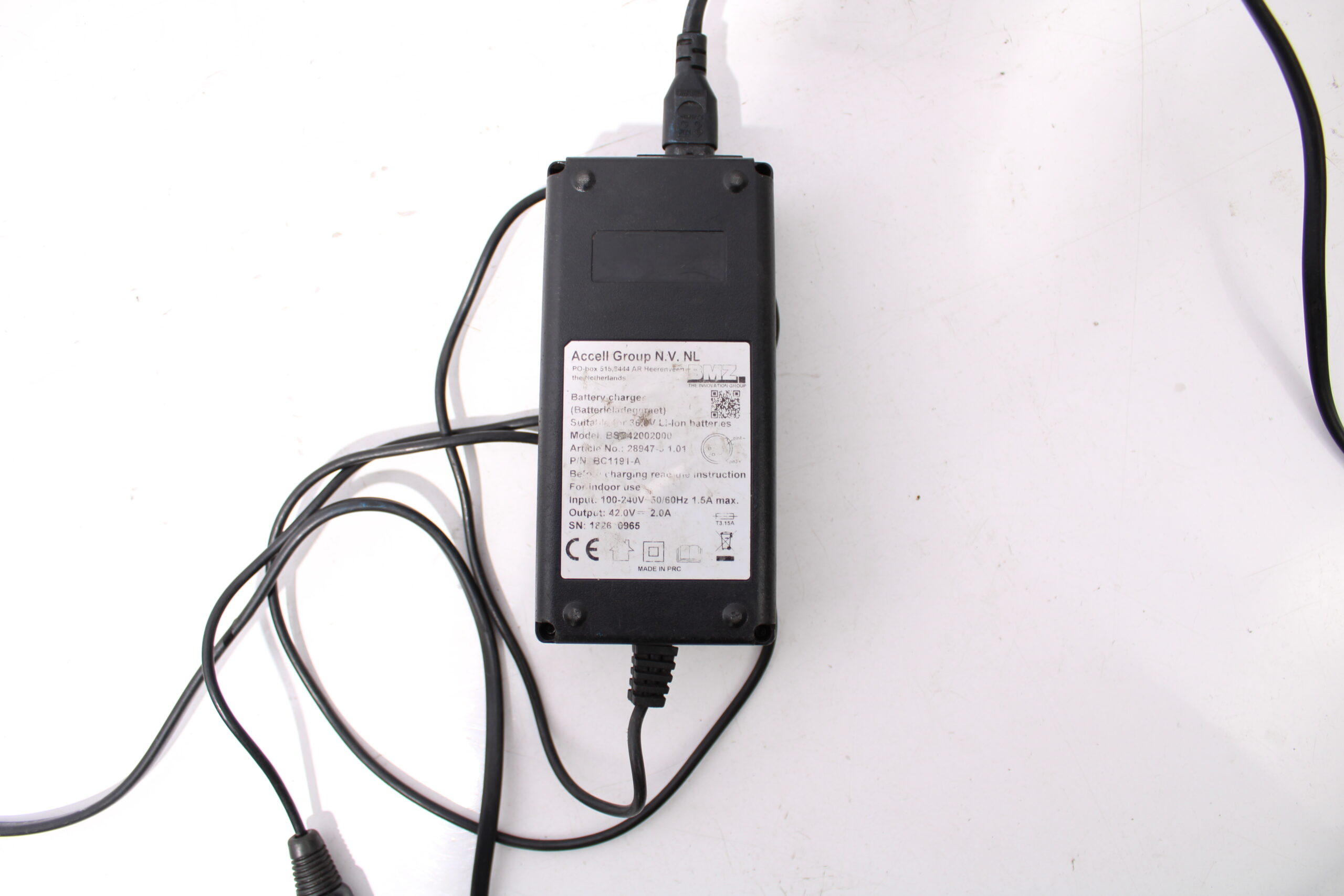 Artikel: Oplader 36v BMZ 4-pins. Dit onderdeel is afkomstig van een Koga E-Xtension elektrische fiets, toepasbaar op Sparta, Batavus en Koga fietsen met een CPU 4 accu. Het betreft een originele onderdeel dat verkeert in goede staat, met mogelijke gebruikssporen.