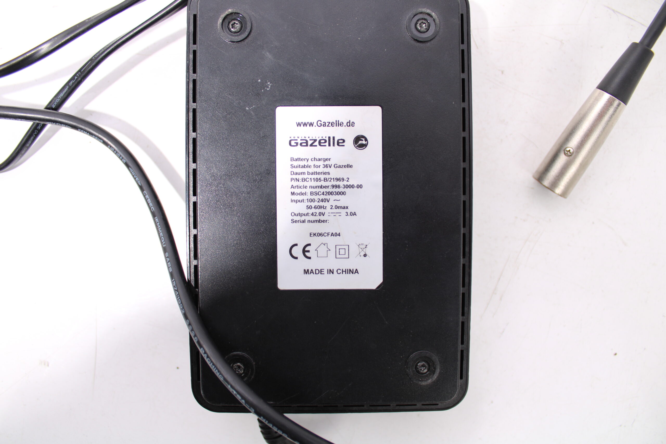 Artikel: Oplader 36 volt (BSC42003000) geschikt voor 4-pins aansluiting. Dit onderdeel is afkomstig van een Gazelle elektrische fiets. Het betreft een originele onderdeel dat verkeert in goede staat, met mogelijke gebruikssporen.