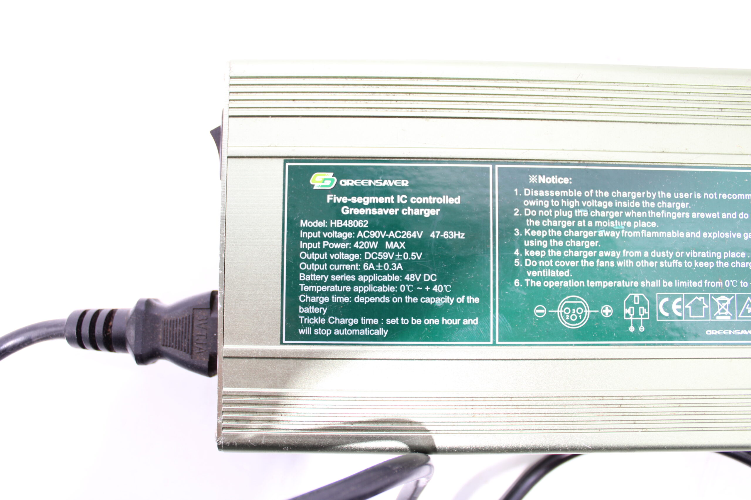 Artikel: Oplader Greensaver (model: HB48062). Dit onderdeel is afkomstig van een elektrische scooter.
