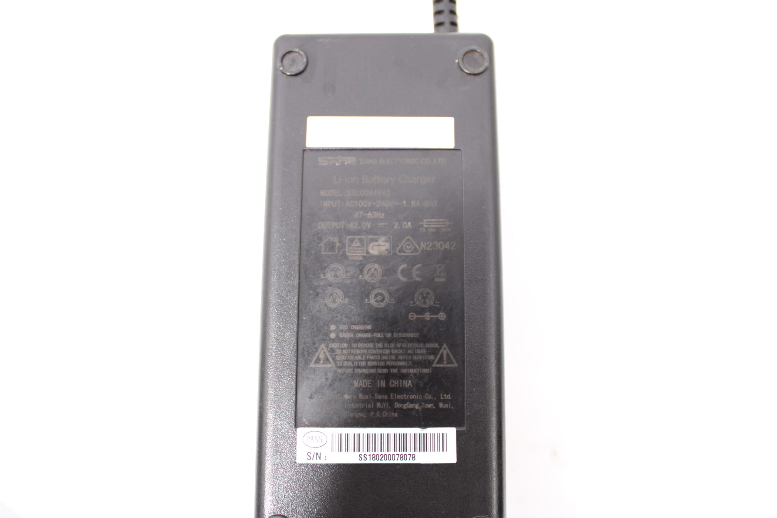 Artikel: Oplader Sans 36v 2A (model: SSL0084V42). Dit onderdeel is afkomstig van een Green Team elektrische fiets.