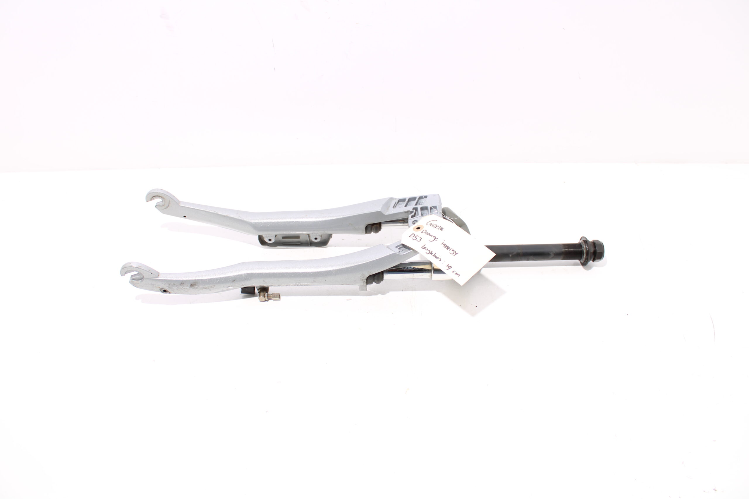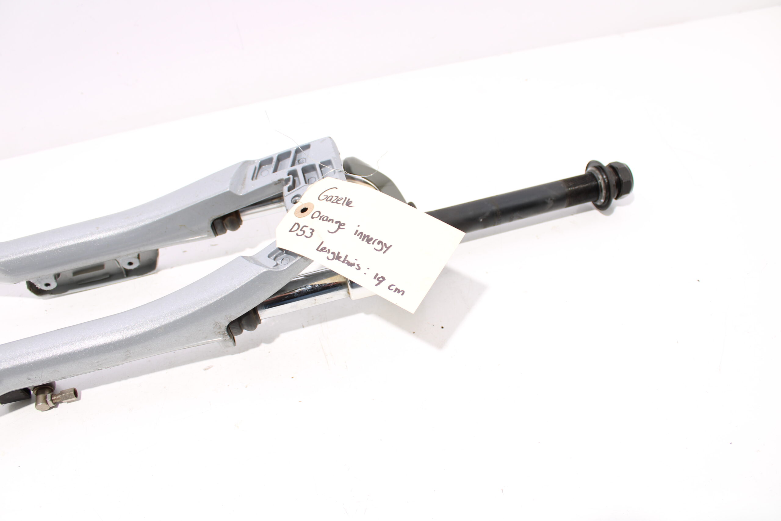 Artikel: Verende voorvork 28 inch afkomstig van een frame met maat D53 (lengtebuis: 19 cm). Dit onderdeel is afkomstig van een Gazelle Orange Innergy elektrische fiets.