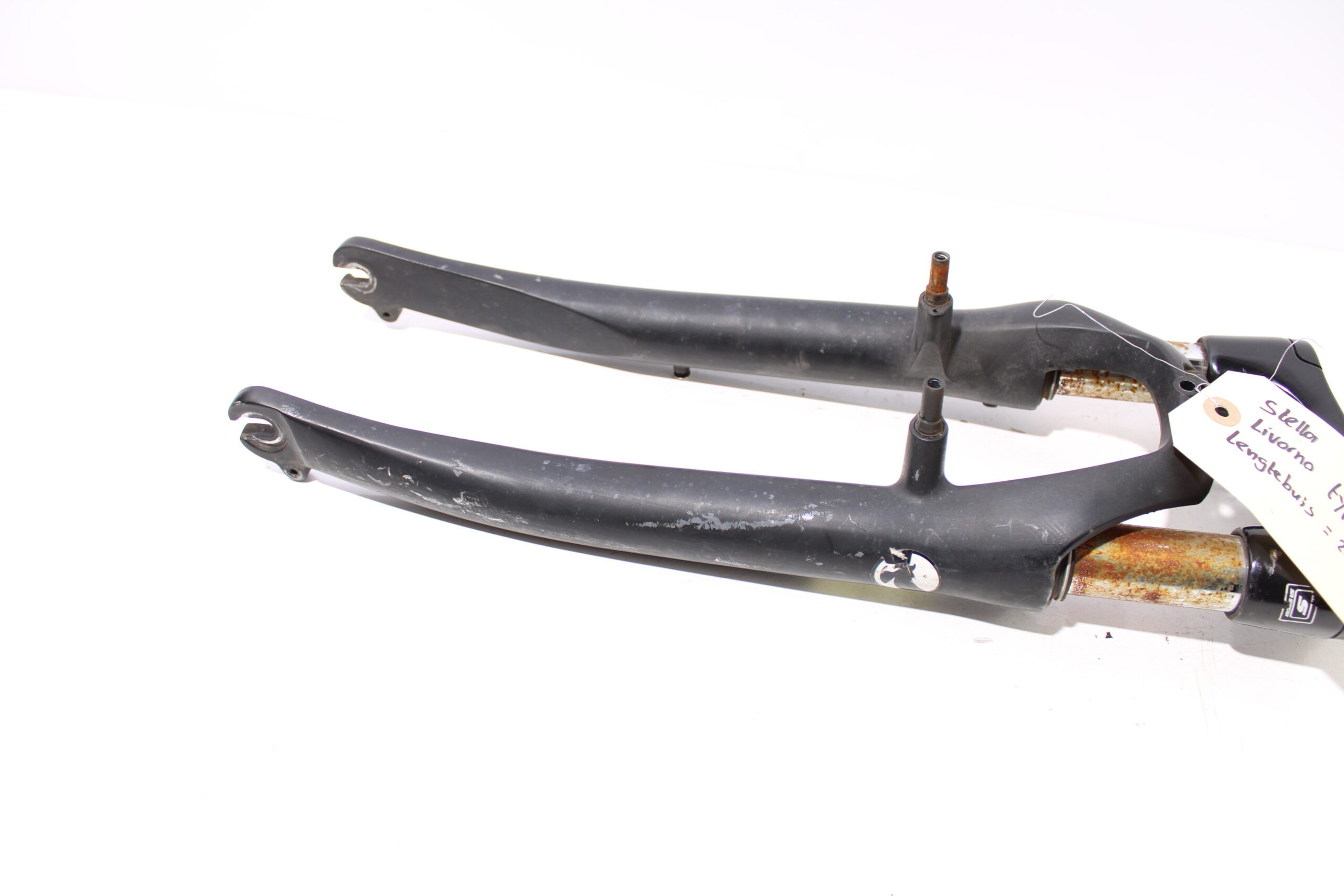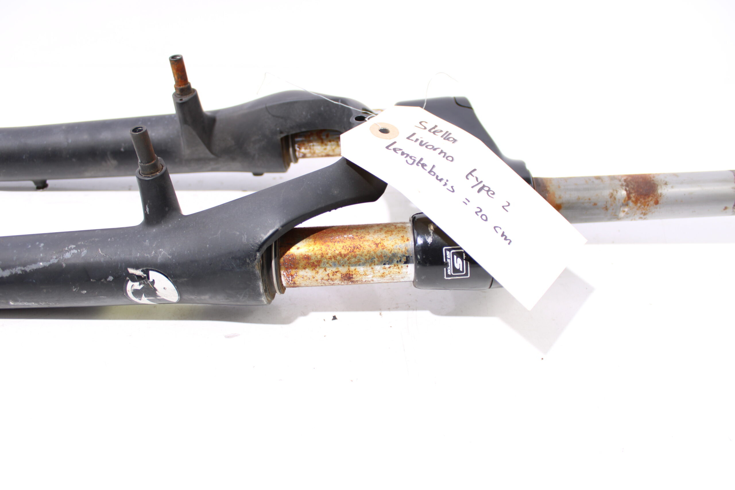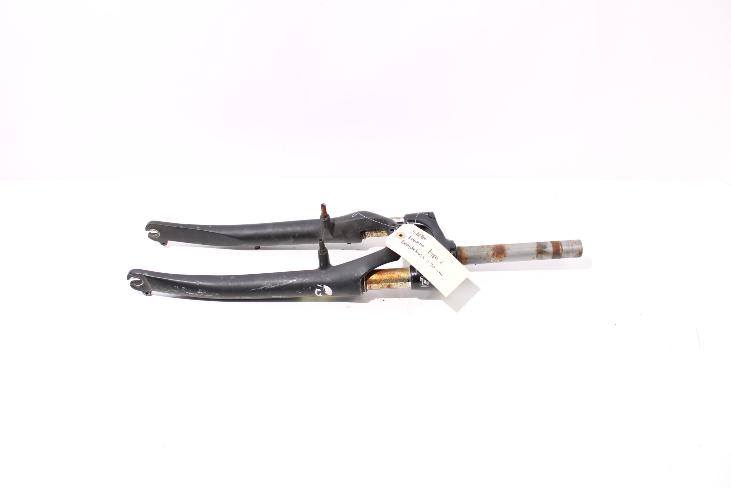 Artikel: Verende voorvork 28 inch (lengtebuis: 20cm). Dit onderdeel is afkomstig van een Stella Livorno elektrische fiets. Het betreft een originele onderdeel dat verkeert in roestige staat, met mogelijke gebruikssporen. Hij veert nog wel goed.