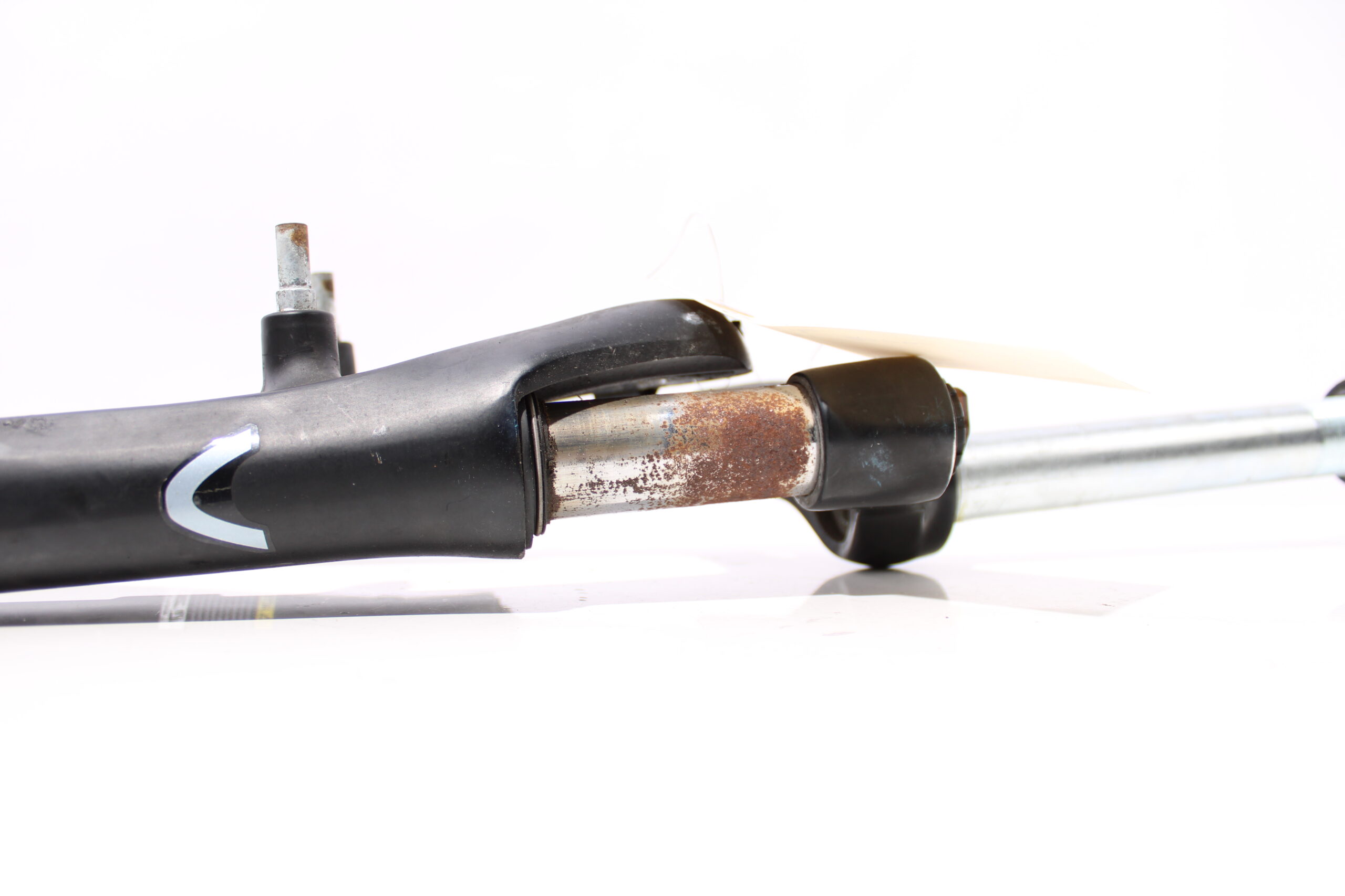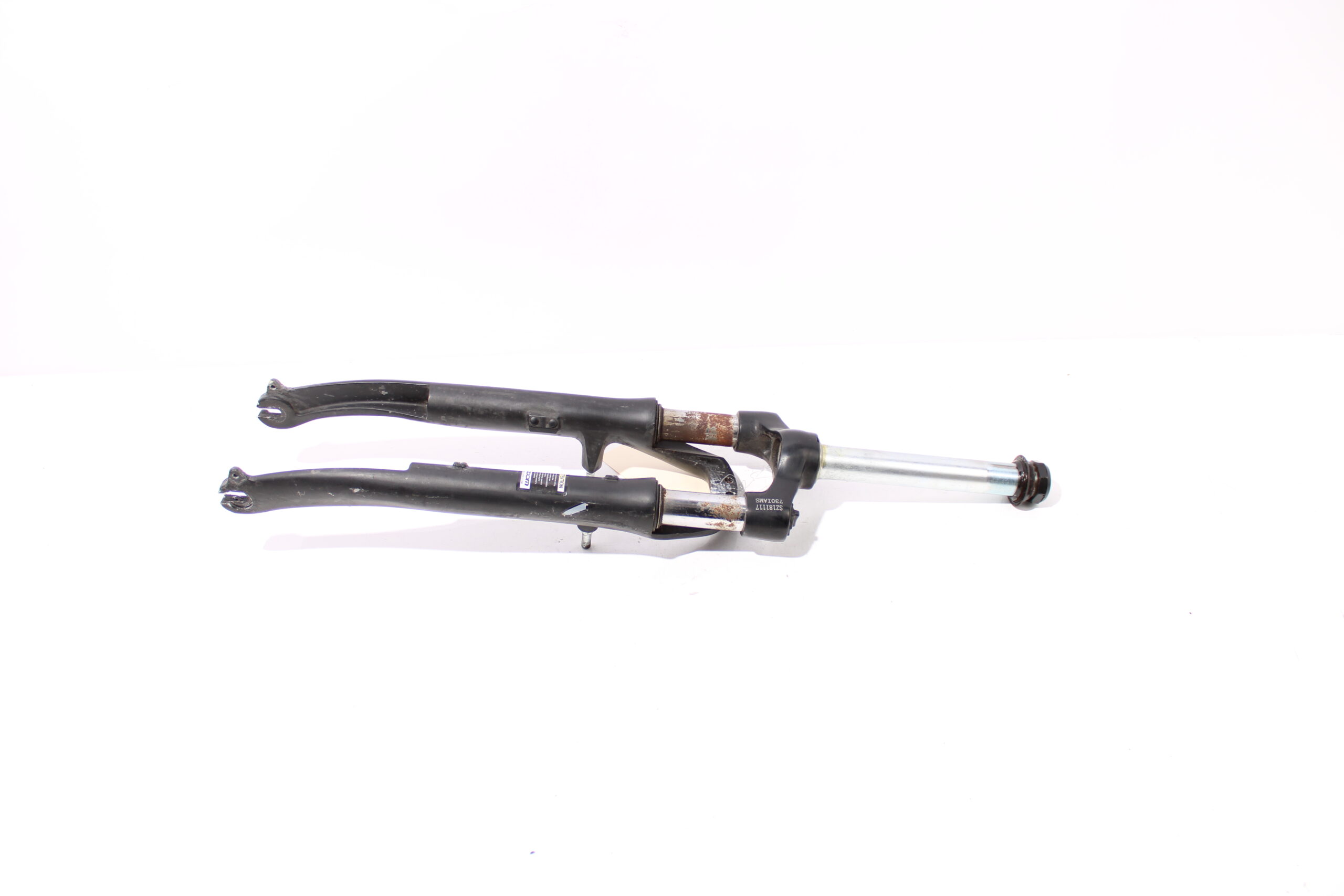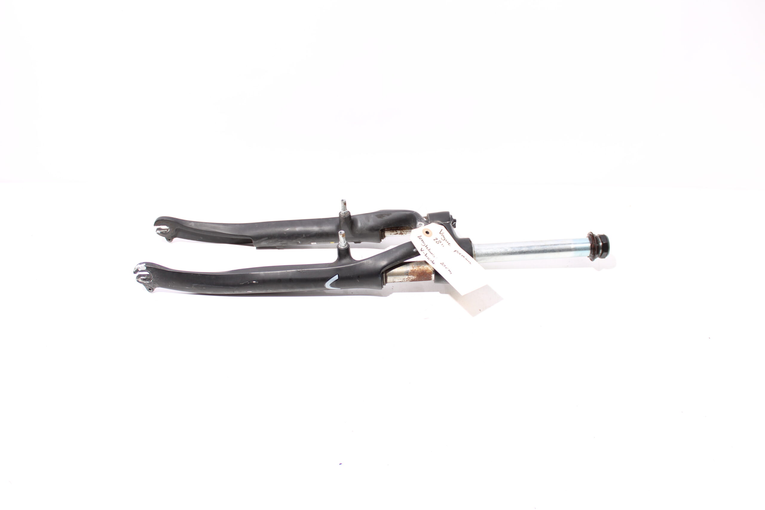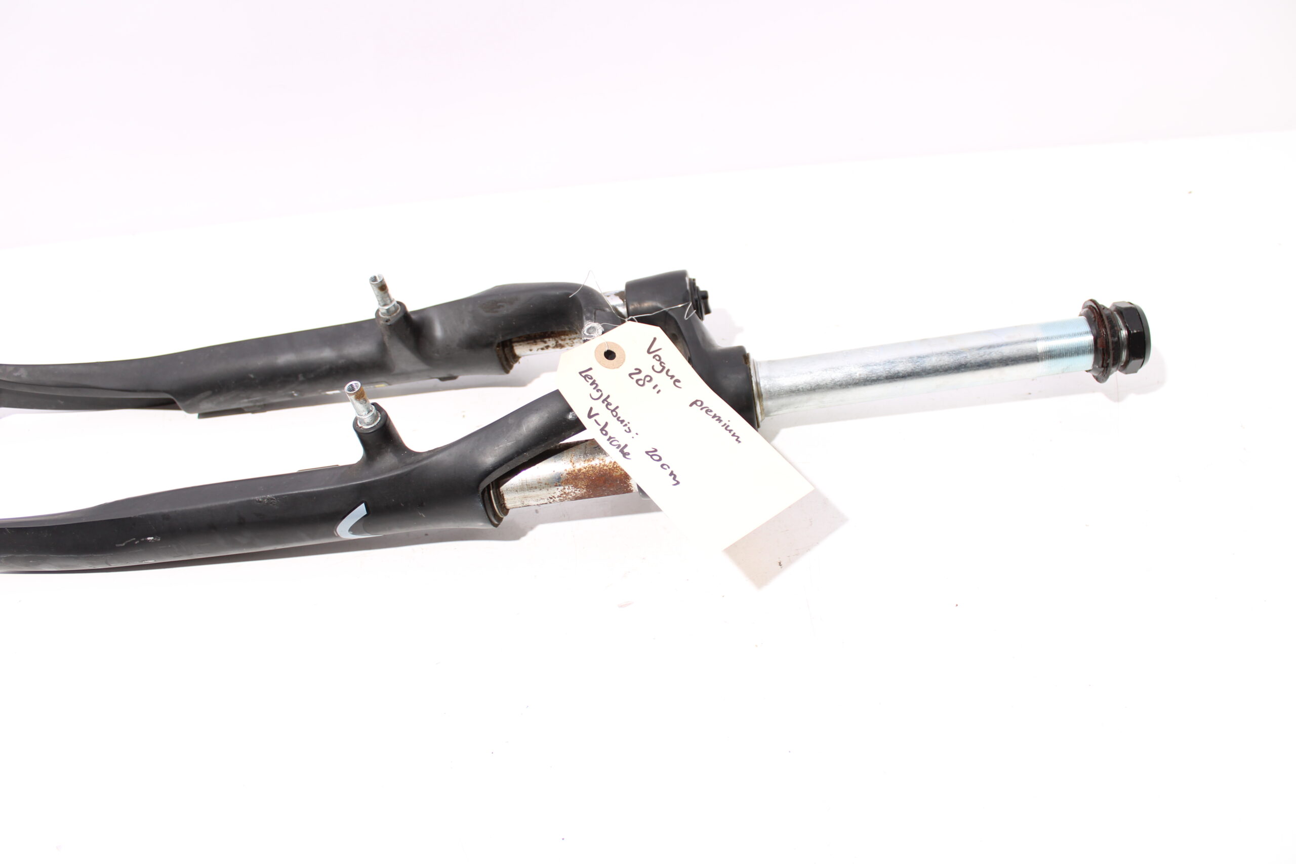 Artikel: Verende voorvork 28 inch zwart (lengte buis: 20cm), geschikt voor V-brake remmen. Dit onderdeel is afkomstig van een Vogue Premium elektrische fiets. Het betreft een originele onderdeel dat verkeert in goede staat, met middelmatige gebruikssporen. Heeft roest op de poten, maar veert nog goed.
