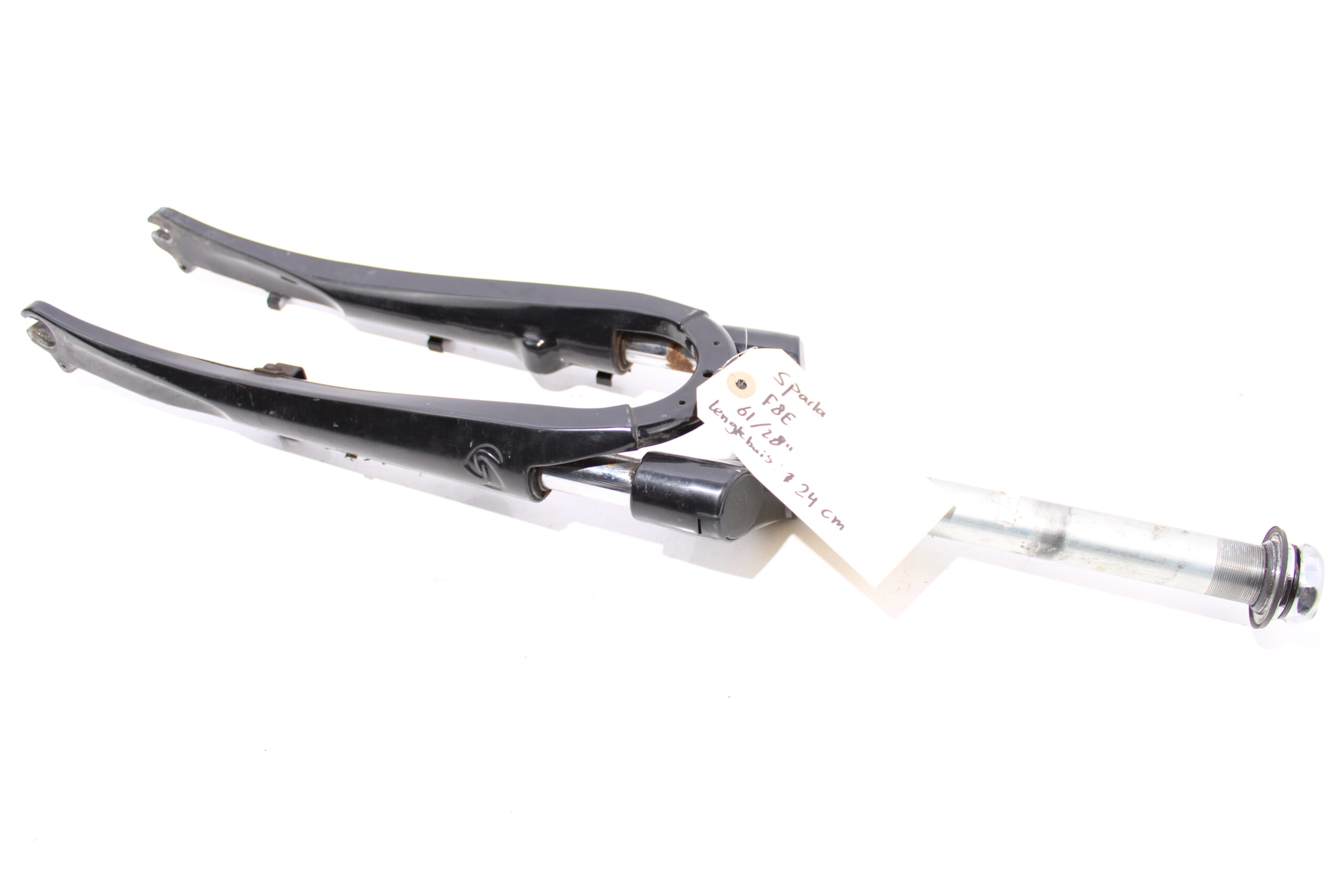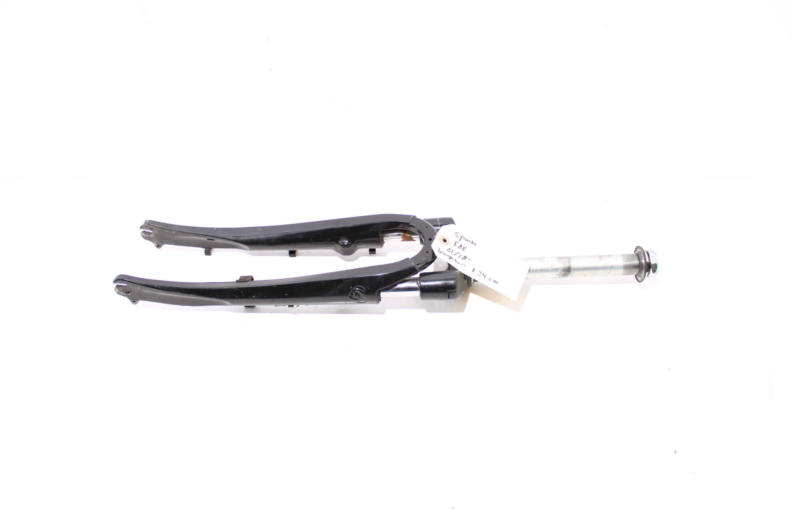 Artikel: Verende voorvork 28 inch, afkomstig van een frame met maat 61 (lengtebuis = 24cm). Dit onderdeel is afkomstig van een Sparta F8E elektrische fiets.