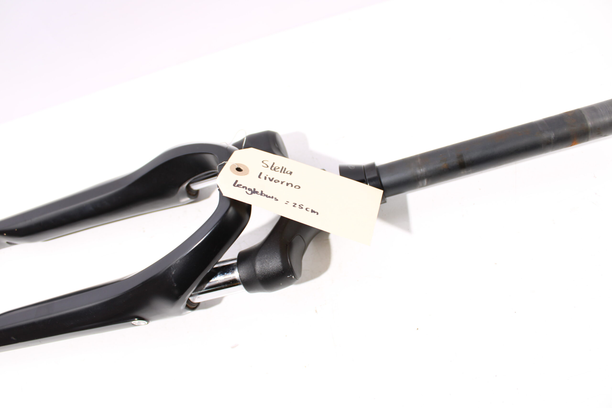 Artikel: Verende voorvork (lengtebuis: 25 cm). Dit onderdeel is afkomstig van een Stella Livorno elektrische fiets. Het betreft een originele onderdeel dat verkeert in goede staat, met mogelijke gebruikssporen.