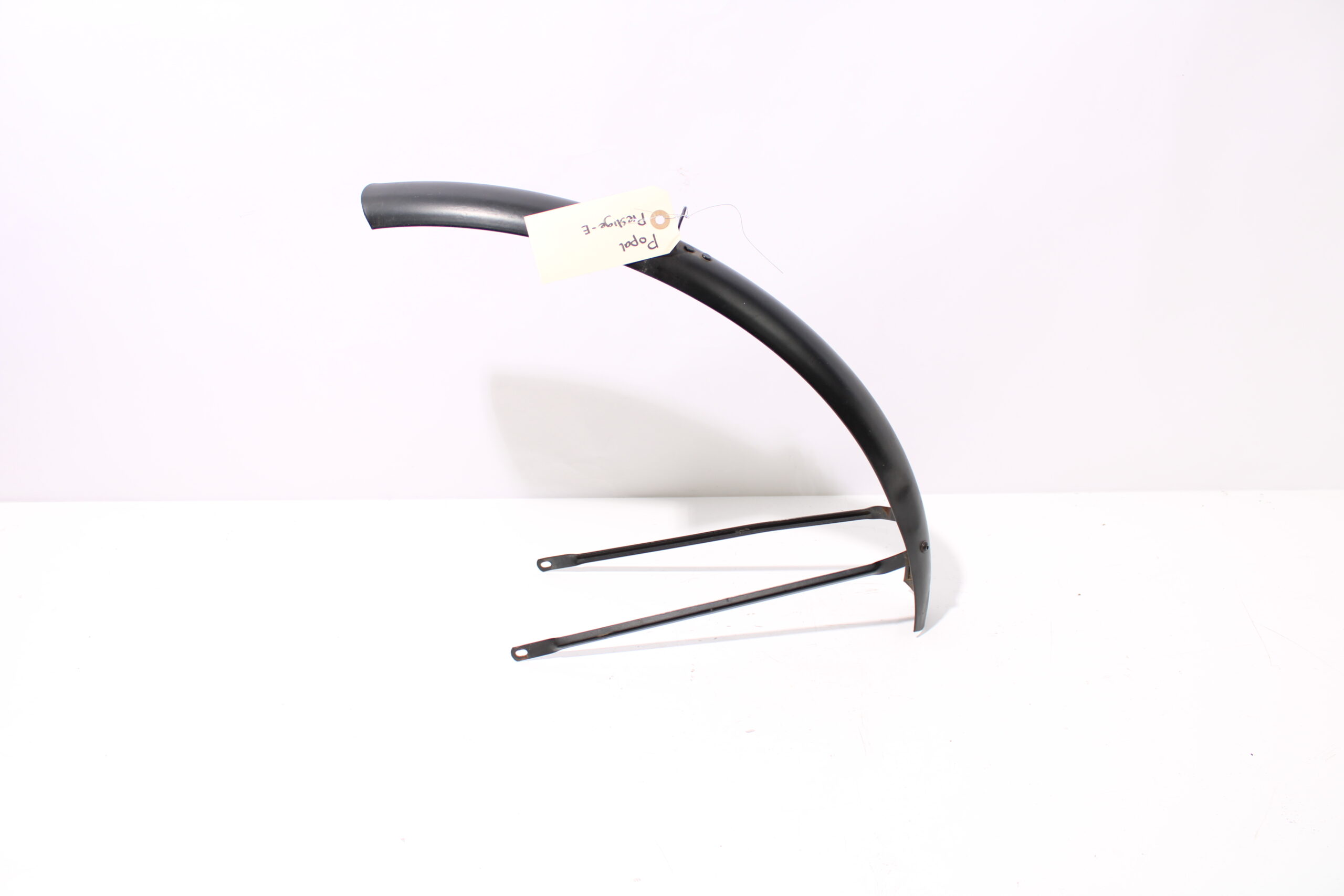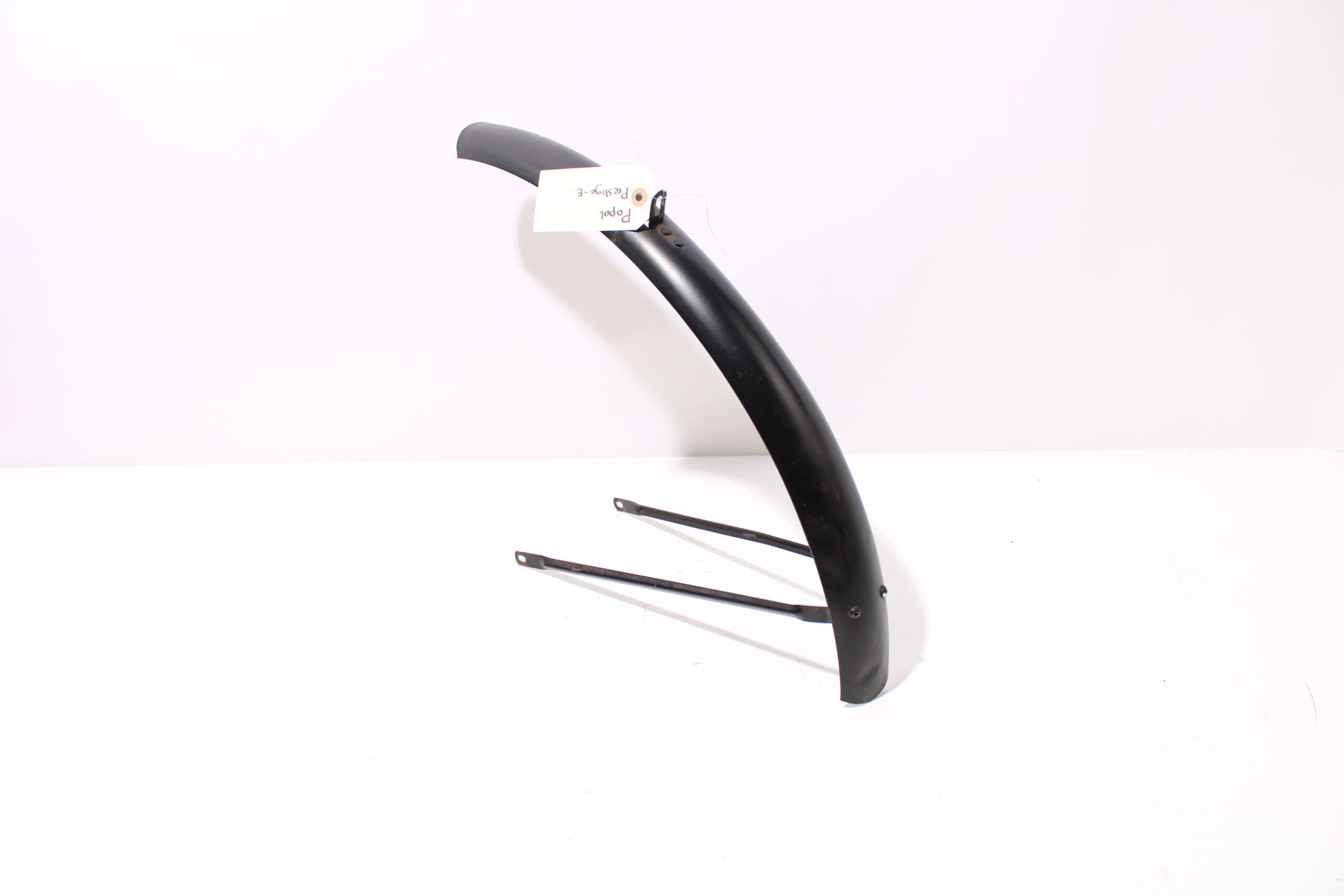 Artikel: Voorspatbord zwart. Dit onderdeel is afkomstig van een Popal Prestige-E elektrische fiets. Het betreft een originele onderdeel dat verkeert in goede staat, met mogelijke gebruikssporen.