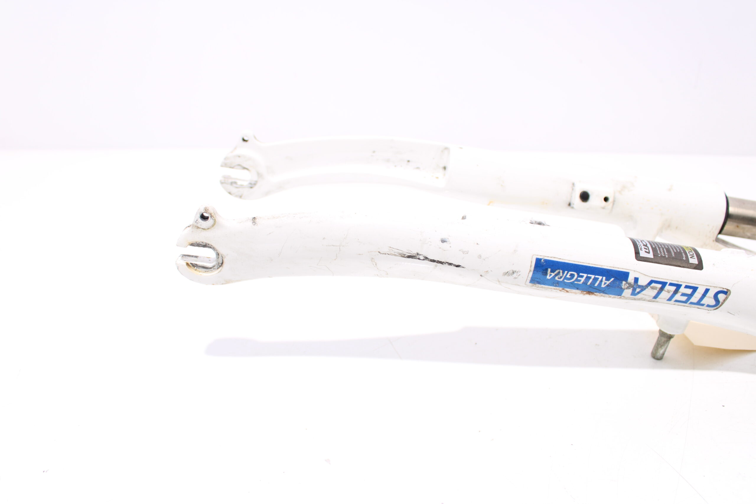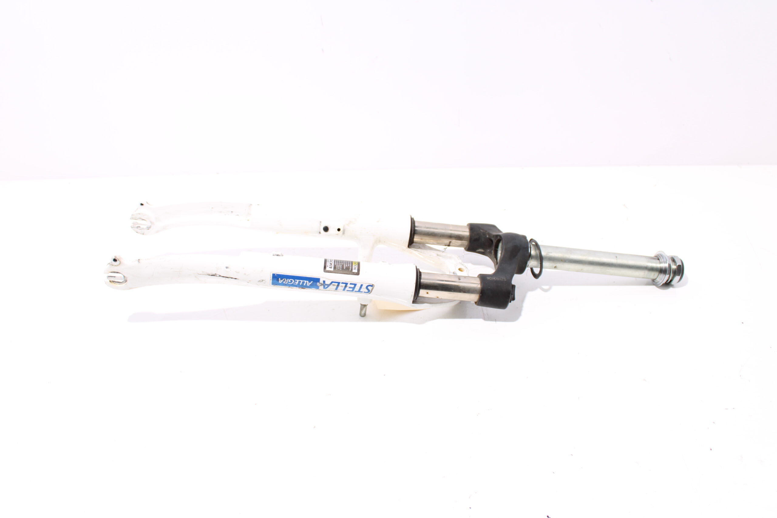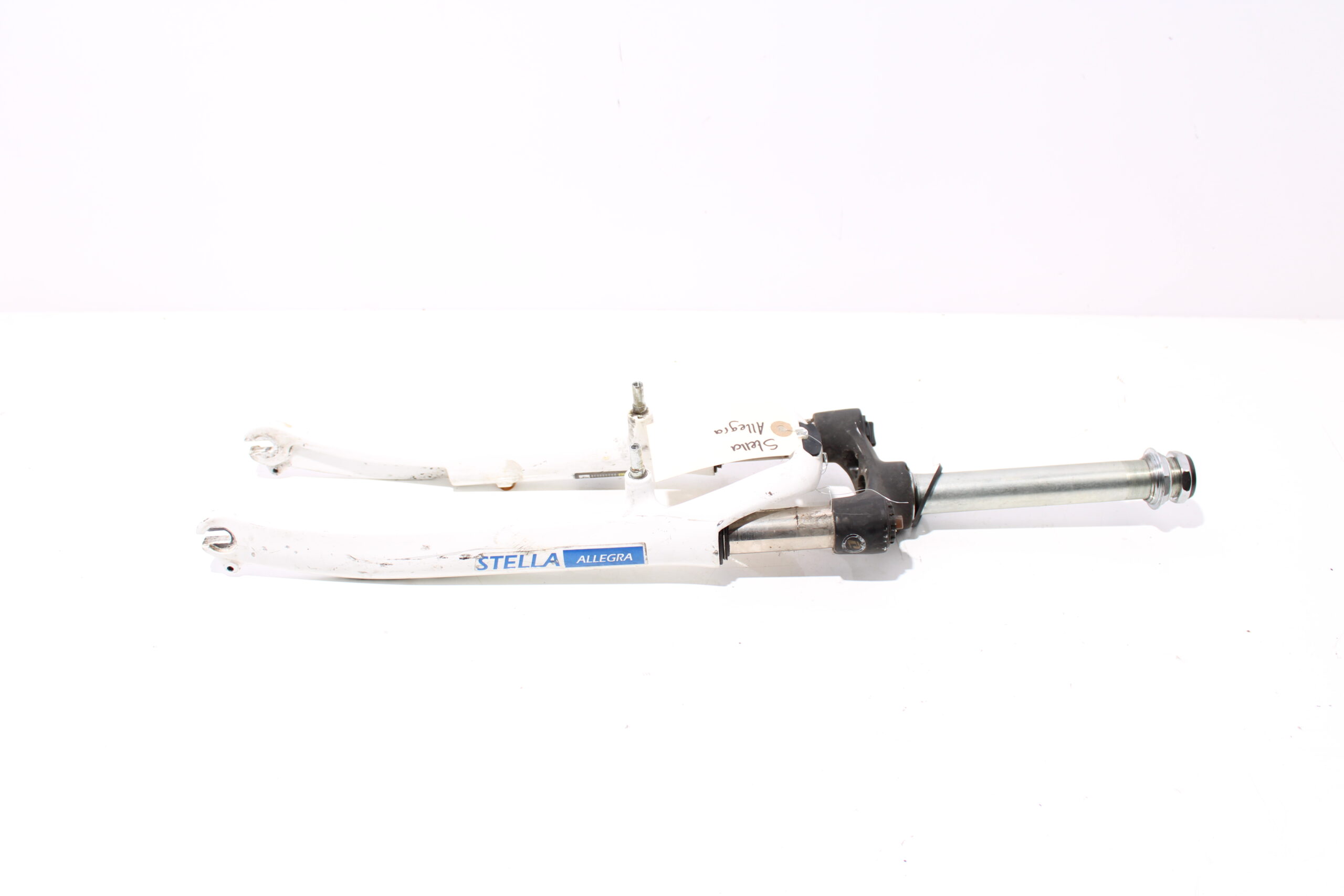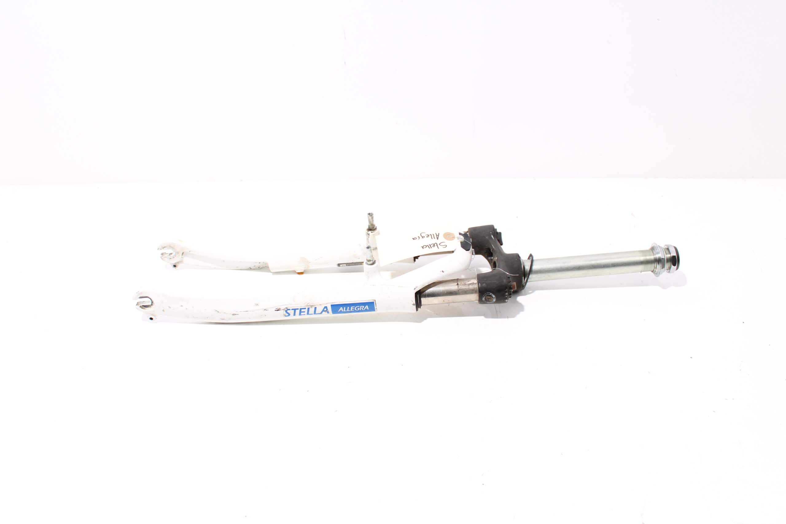 Artikel: Voorvork 28 inch wit, geschikt voor v-brake remmen. Dit onderdeel is afkomstig van een Stella Allegra elektrische fiets.