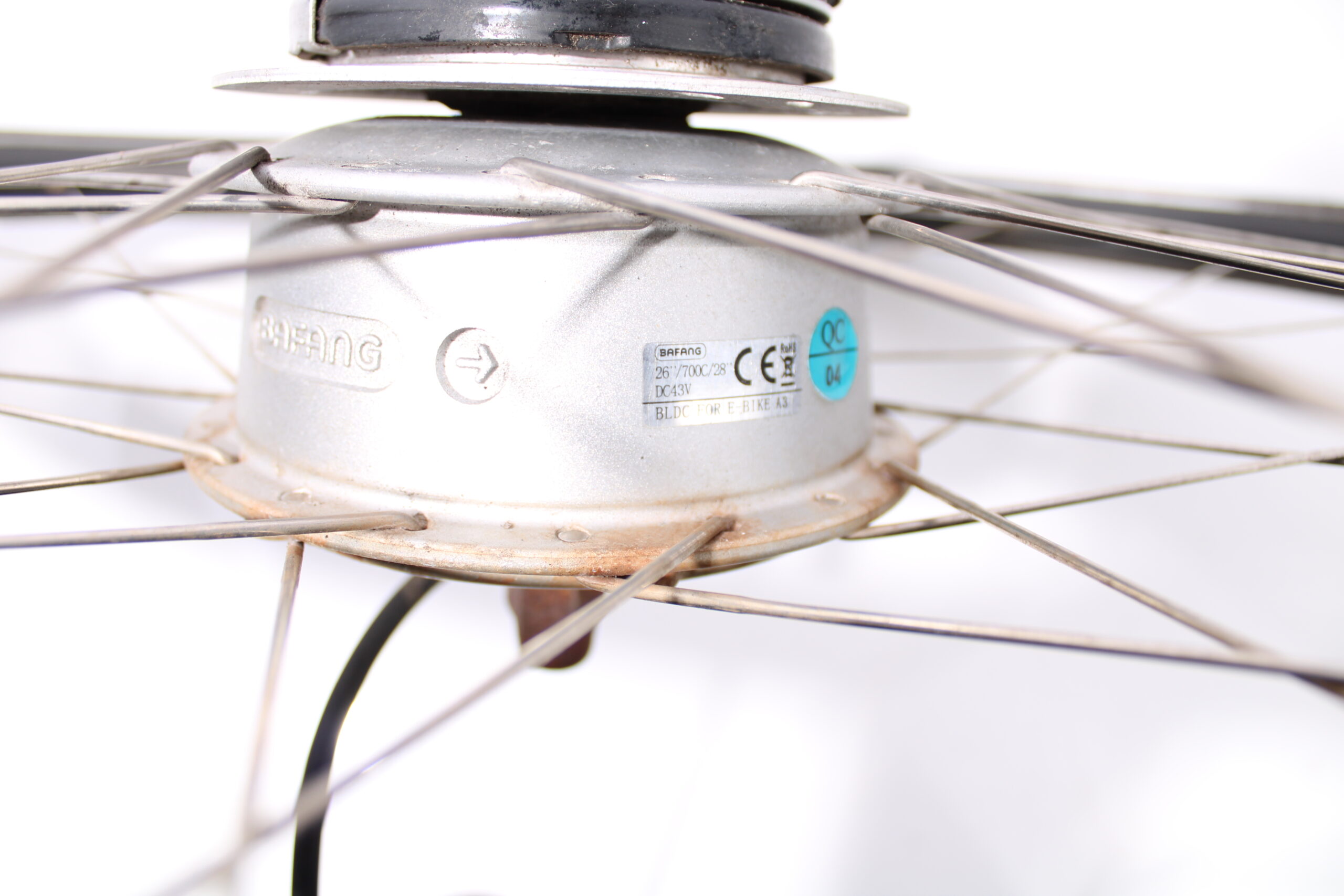 Artikel: Voorwiel motor van het merk Bafang met 9-pins aansluiting. Dit onderdeel is afkomstig van een Cortina E-U1 elektrische fiets. Het betreft een originele onderdeel dat verkeert in goede staat, met mogelijke gebruikssporen.